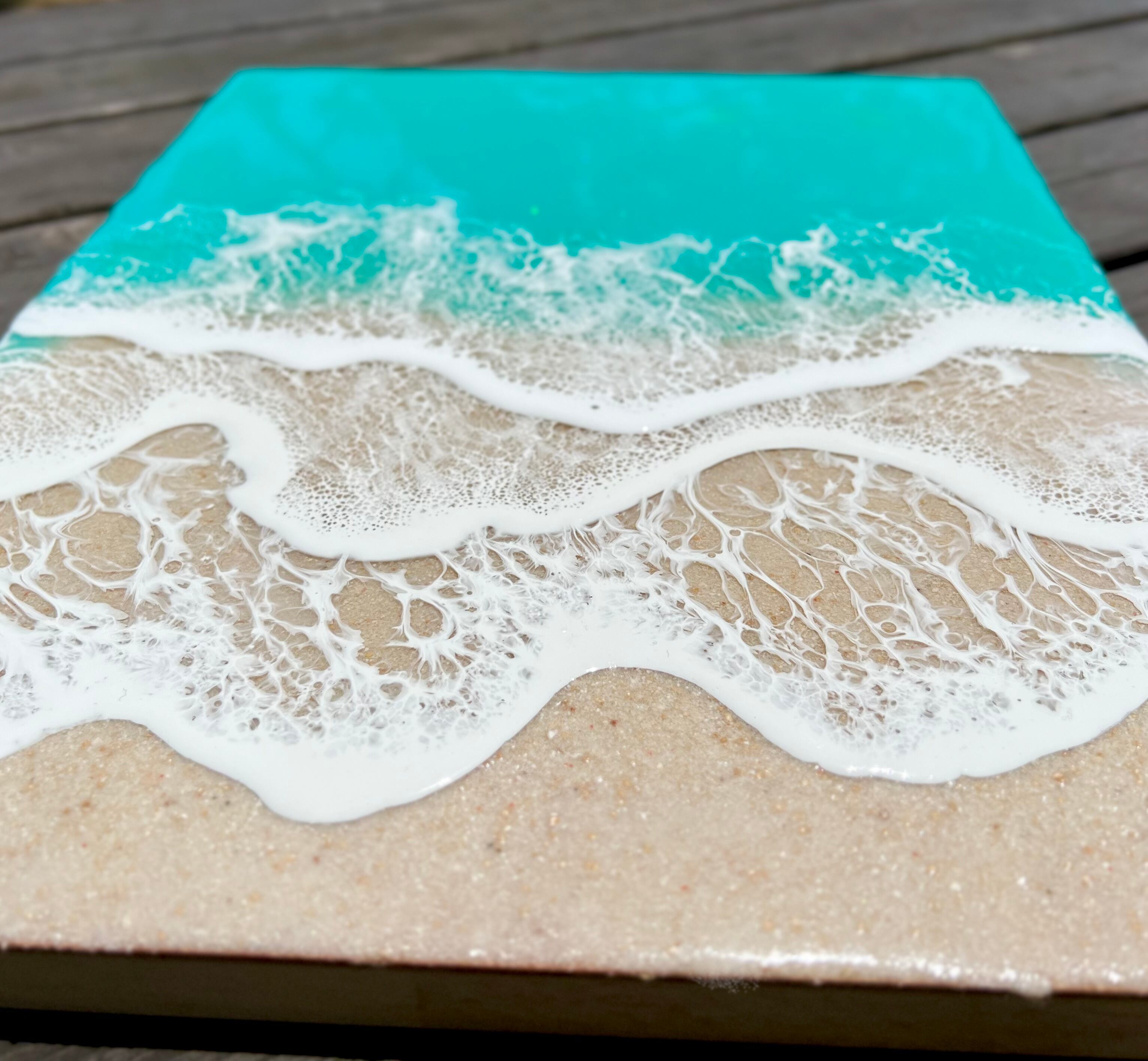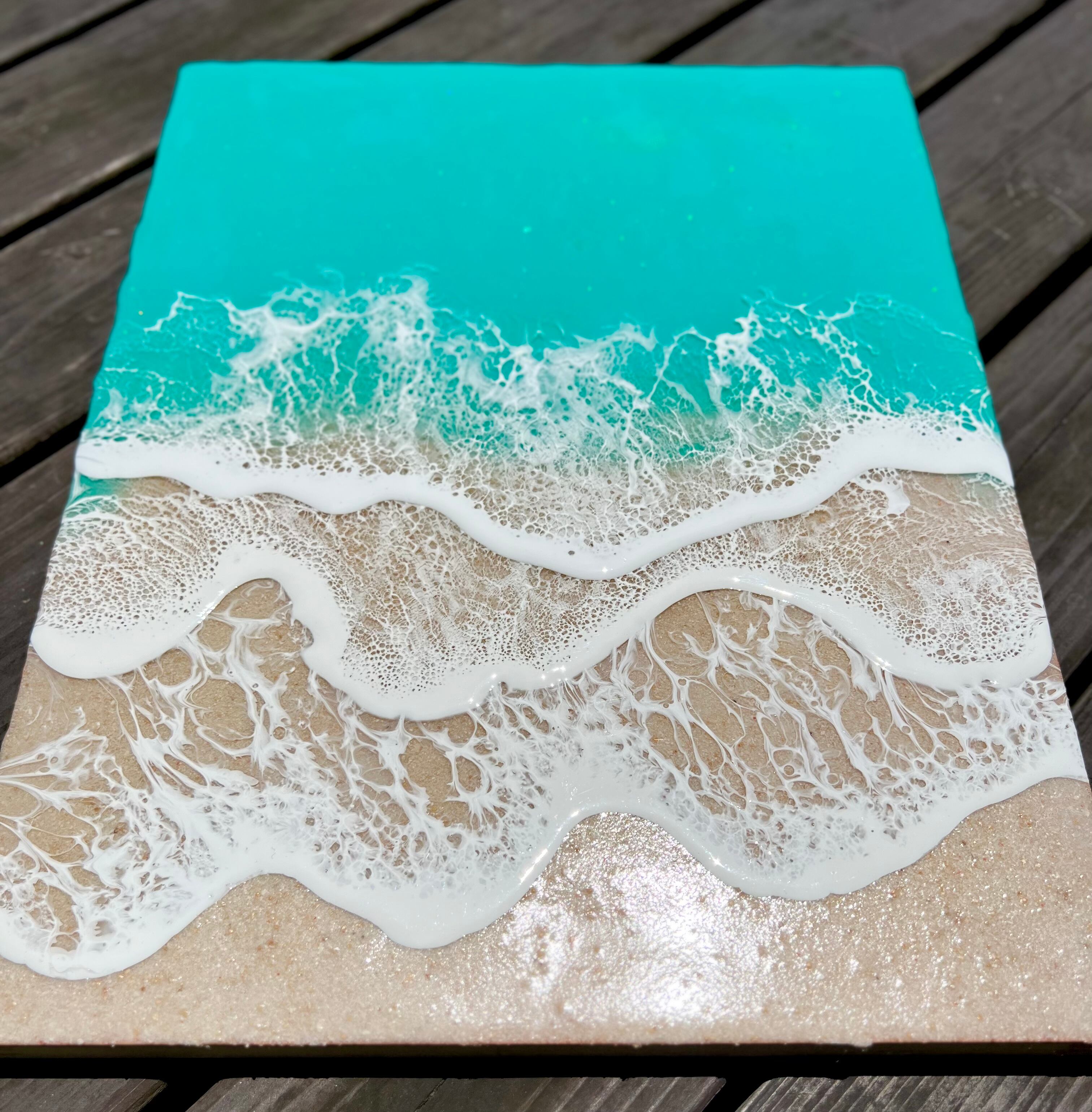 エメラルドグリーンが輝く美しい海、透明感あふれるレジンと鮮やかな色合いが、まるで本物の海を見ているかのような感覚を与えます。壁に飾るだけで部屋全体がリゾート気分に包まれます。