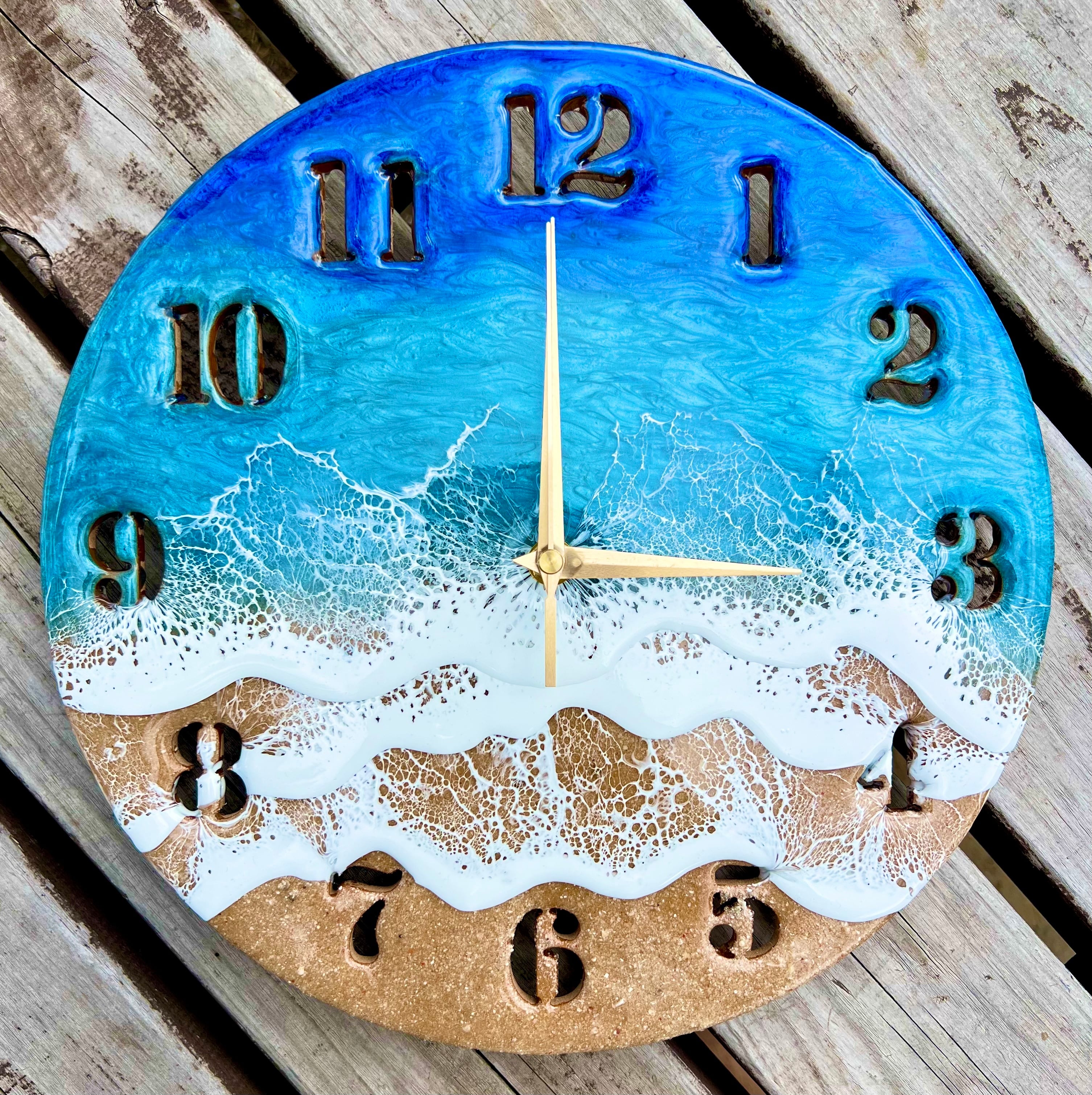 時間を海と共に感じる、美しいレジンアートの時計です。海の波の美しい模様が1つずつ手作業で作られ、それぞれの色合いや形状が異なるため、世界にひとつだけの特別な時計となっています。