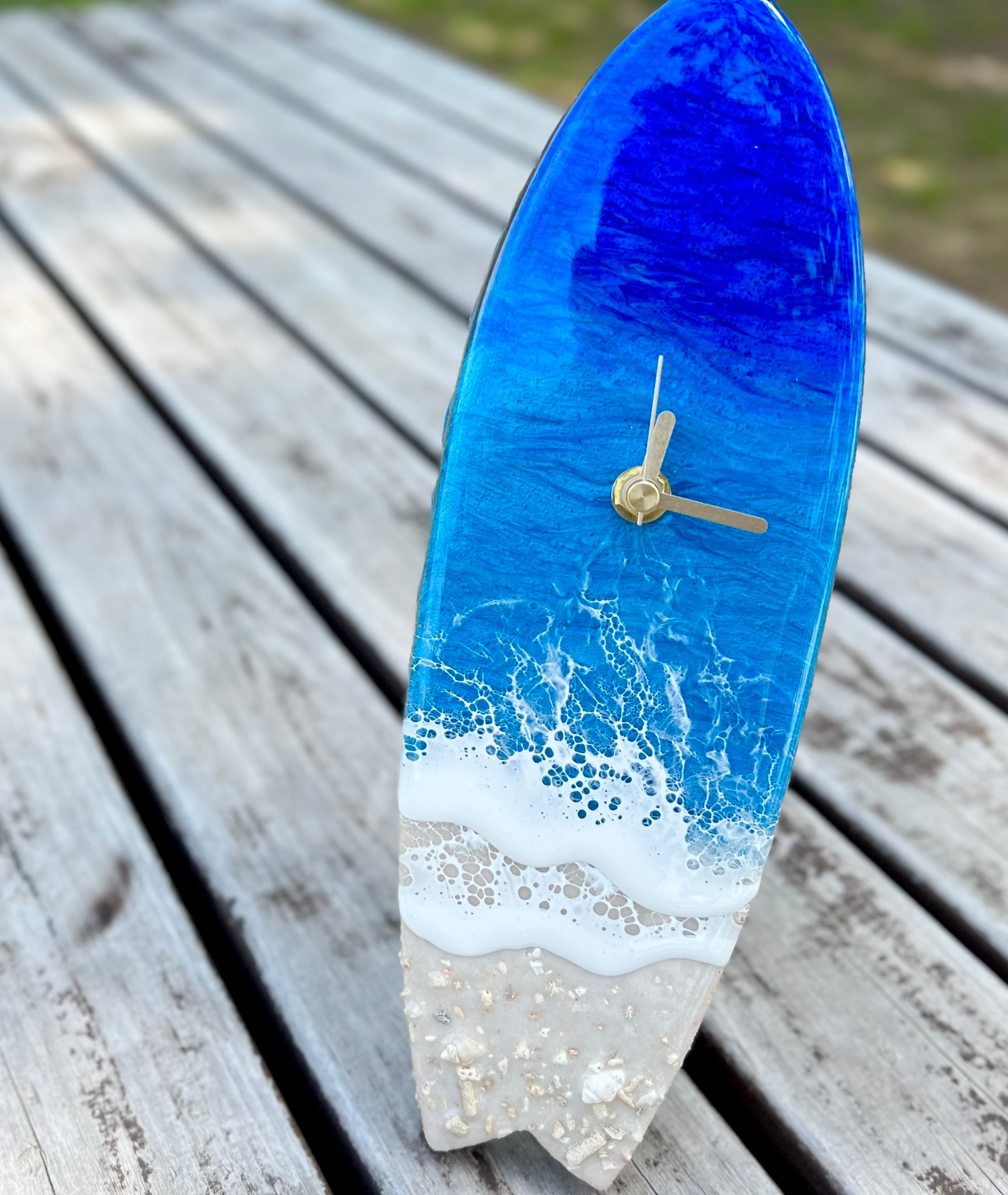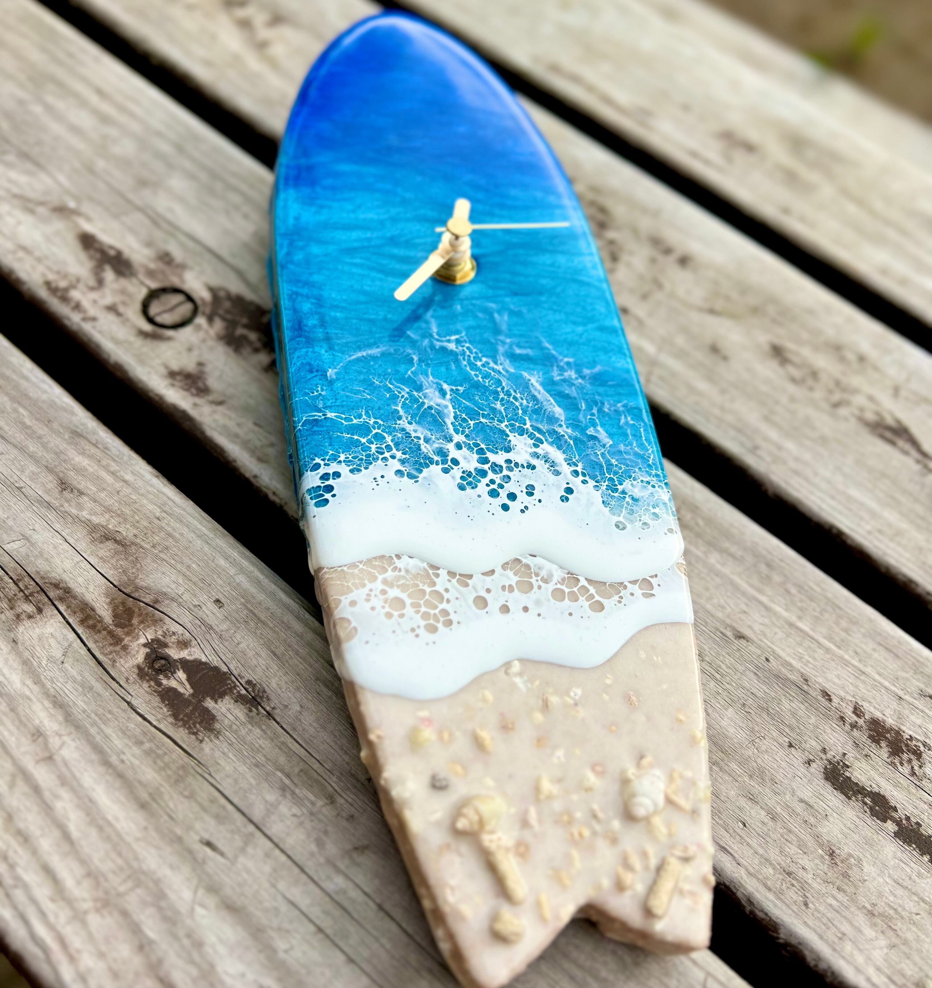 海レジンアートのサーフボード時計Mサイズです。まるで本物のサーフボードが壁に飾られたような存在感は、お部屋やショップのインテリアにぴったりです。